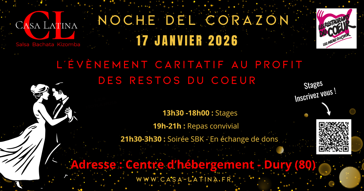 La Noche del Corazon 17 janvier 2026 Par Casa Latina 24 novembre 2025 0 Une journée exceptionnelle! Workshop, Repas, Soirée SBK. Mais surtout, la seule soirée Latino caritative sur Amiens au profit des Restos du Cœur ! . . . . . . Noce_del_corazon_2026_Présentation_251201_181237[1]Télécharger
